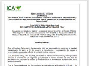 “Por medio de la cual se declara en cuarentena sanitaria en las veredas de Arroyo de Piedra y Arroyo Grande del departamento de Bolívar dada